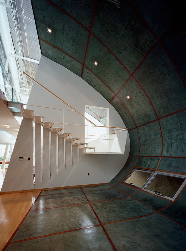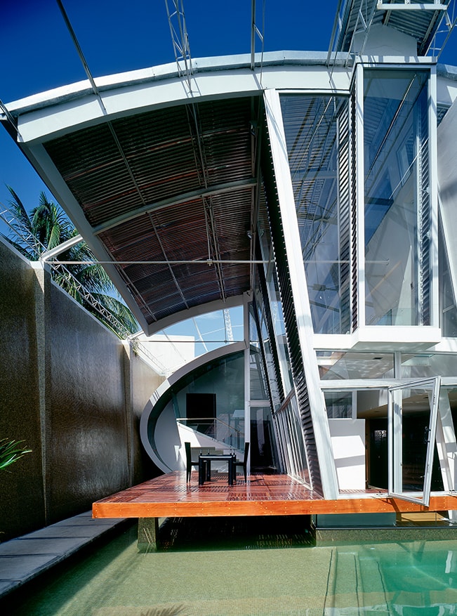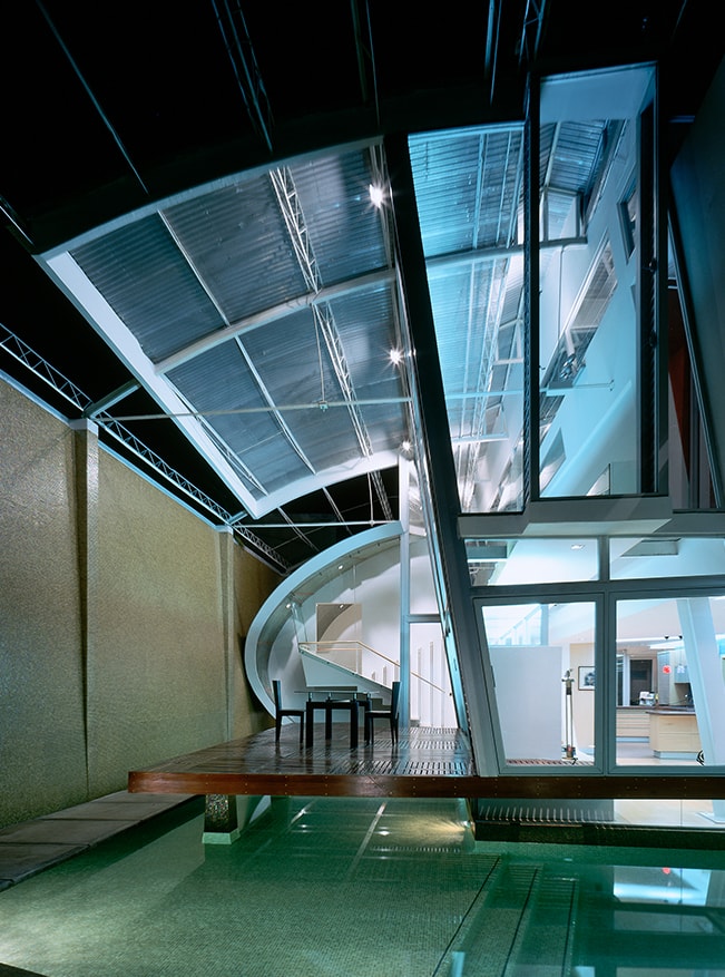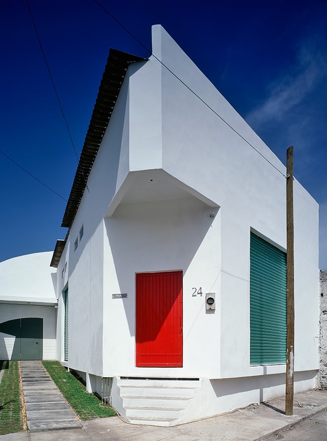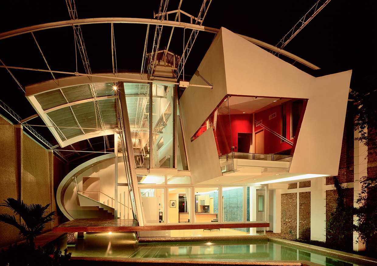 Una bodega ubicada en un solar de alta densidad urbana, funge como un contenedor par a proteger la mercancía que se almacena en su interior. Como un estuche de guitarra, donde el instrumento es el generador intersticial de barreras de protección, la casa se separa de su envolvente divorciándose de los muros originales que resguardan el preciado objeto, además de ser proyectada sobre una piscina que separa al edificio de sus cimentaciones.