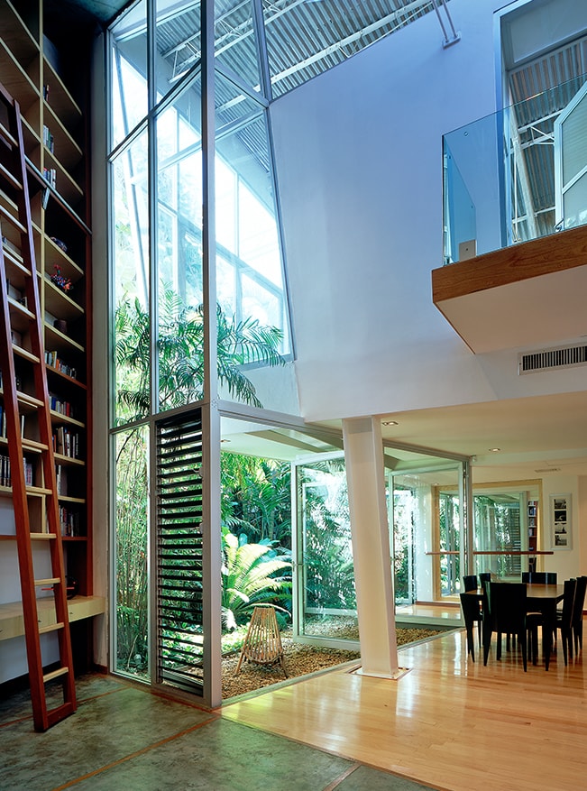 Entrando a la bodega las expectativas cambian radicalmente, uno espera un espacio interior de características especiales, en lugar de eso, al entrar se descubre un jardín exterior de exuberante vegetación tropical. El juego continúa a lo largo del recorrido; al acercarse a la casa la relación interior-exterior continúa siendo vaga, espacios que presumidamente son interiores se encuentran fuera de la envolvente de la casa pero adentro de los grandes muros del contenedor exterior.