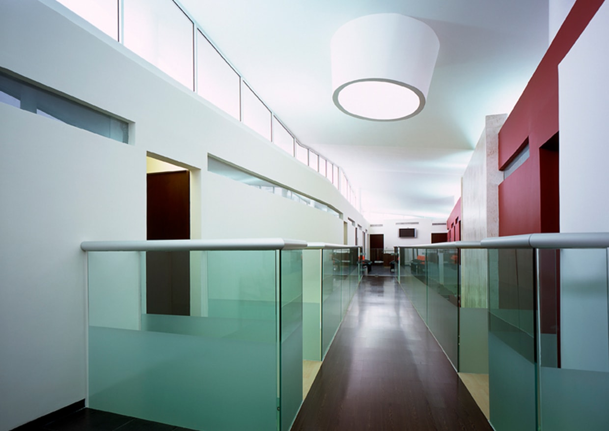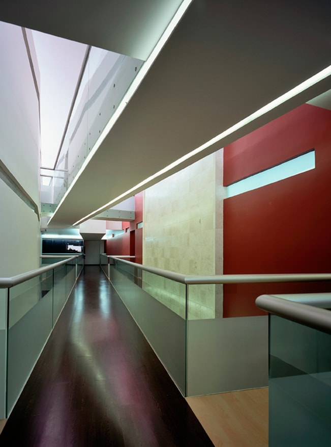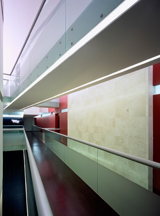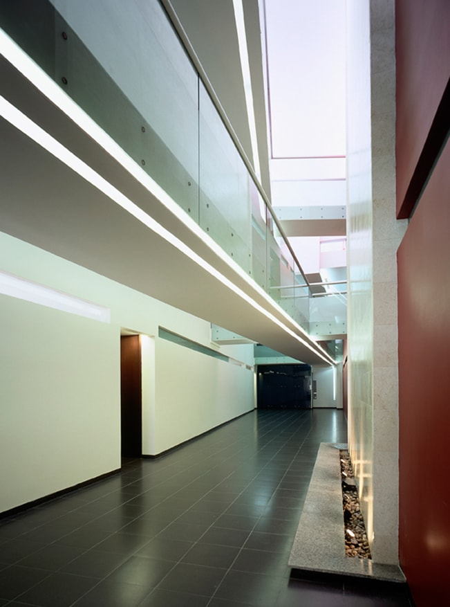 El CDI gira en torno a un esquema de patio central por el cual cruzan puentes a manera de grandes arterías de conexión horizontal entre los vestíbulos y las zonas de trabajo, formando parte de un paisaje interior que filtra la luz de los ventanales ubicados en la planta superior.