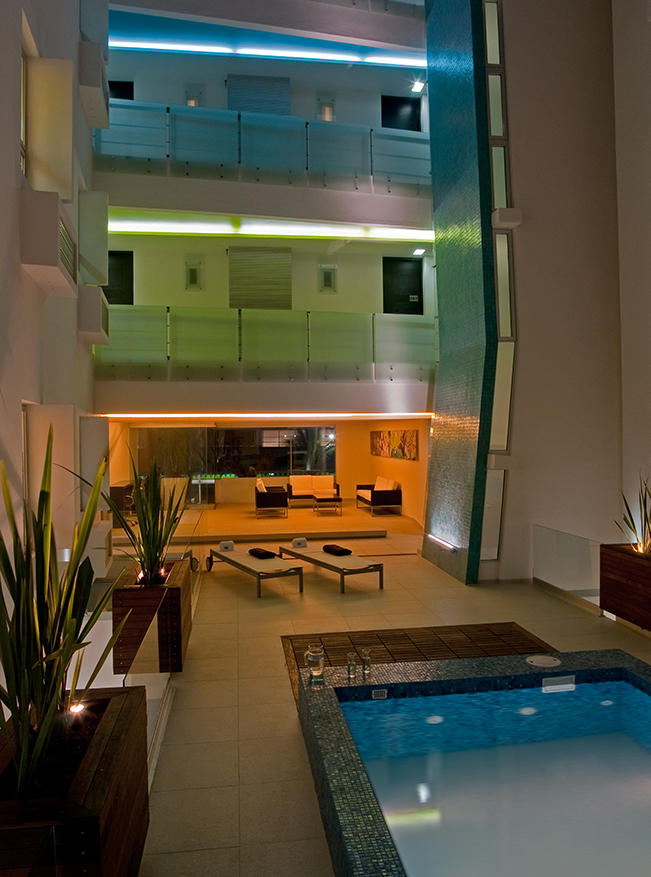 Pensado originalmente como un hotel para turismo itinerante por sus cercanías a las principales centrales de transporte terrestre, el proyecto parte de la idea de excavación como principio de diseño, conformando como objeto arquitectónico un volumen geométricamente definido dentro de un predio de tres colindancias, al cual se le van extrayendo piezas para dar lugar a espacios abiertos, grietas, ventilaciones, recorridos, iluminación natural y 58 habitáculos en un esquema de patio abierto elevado, transparente.